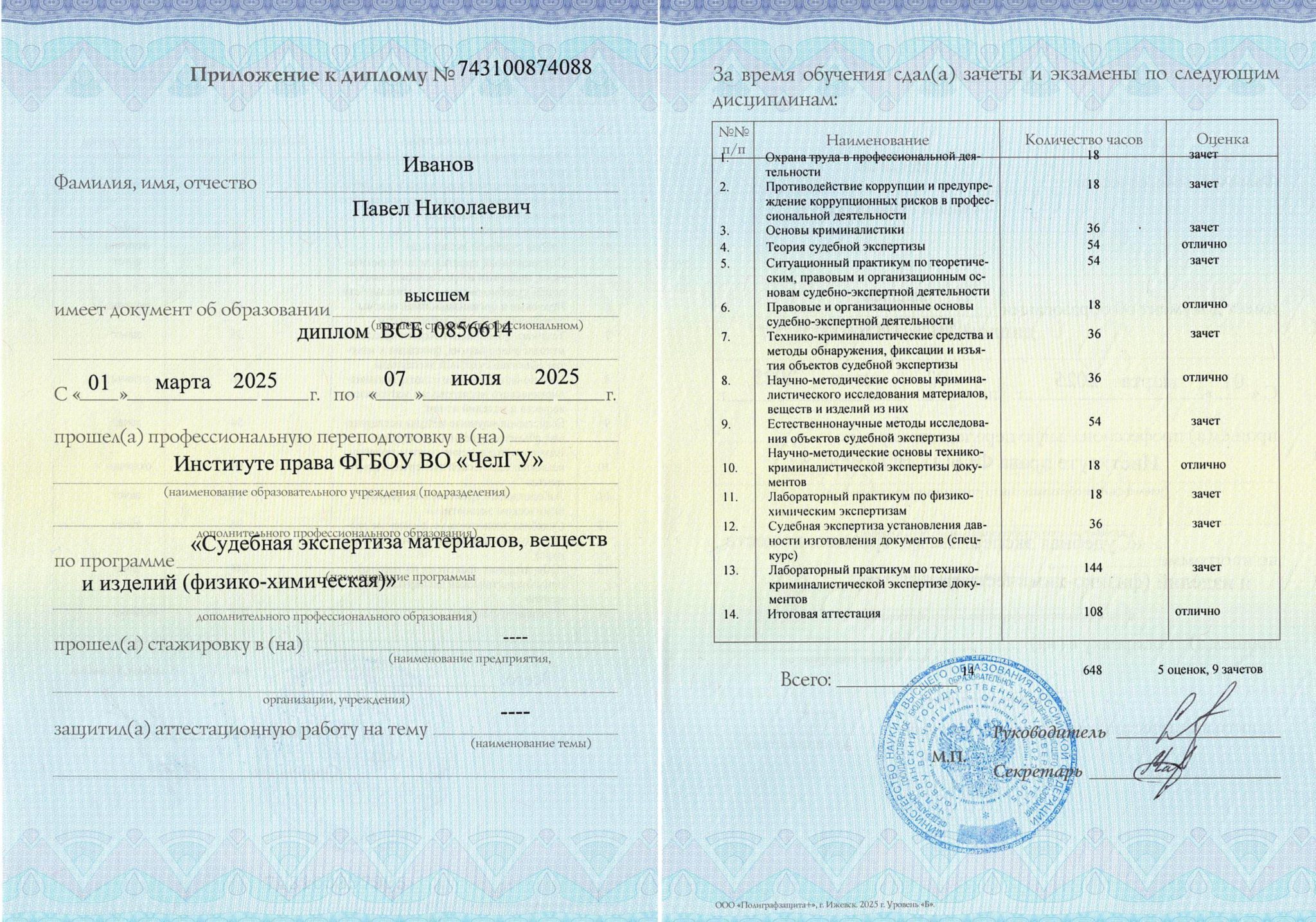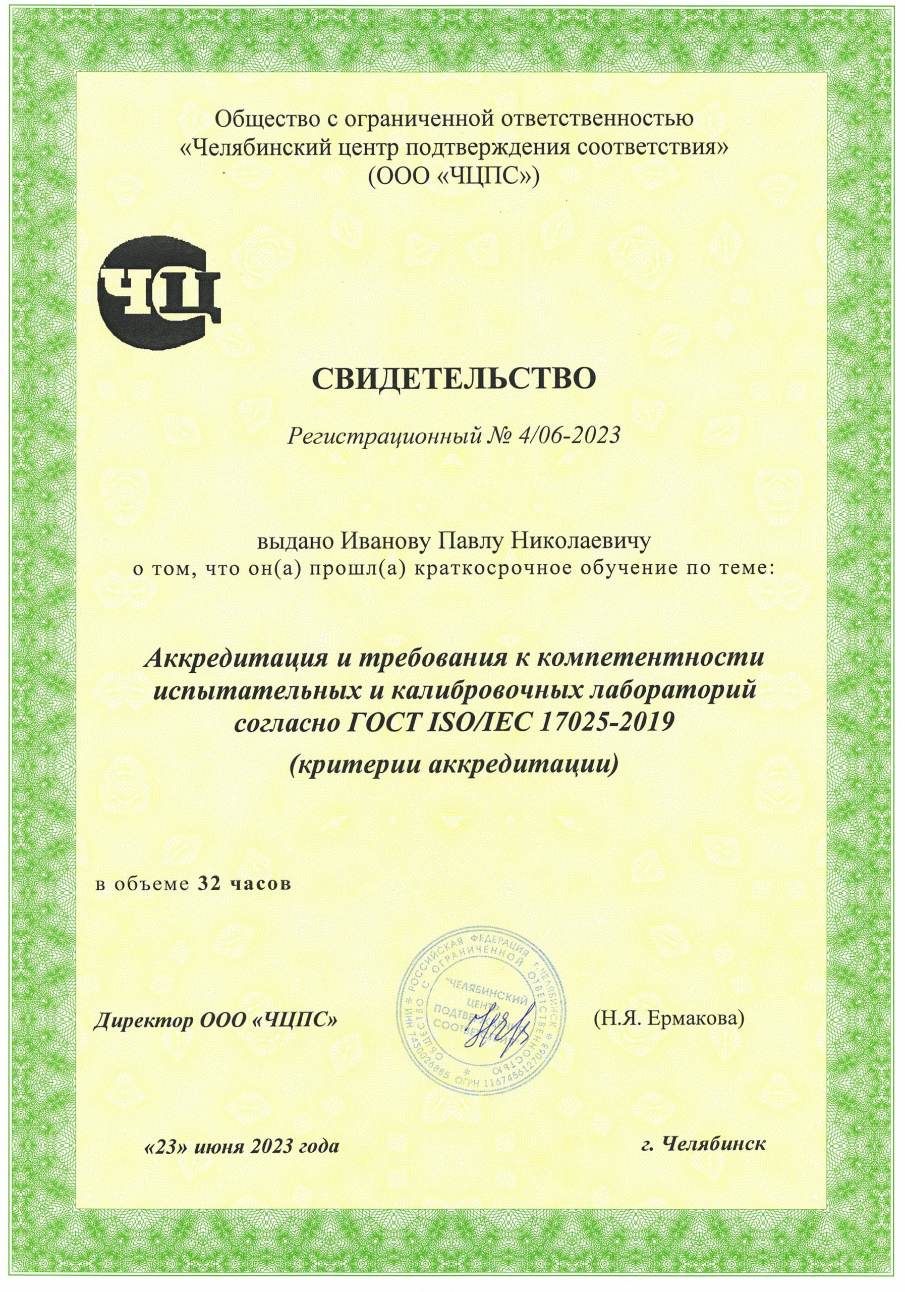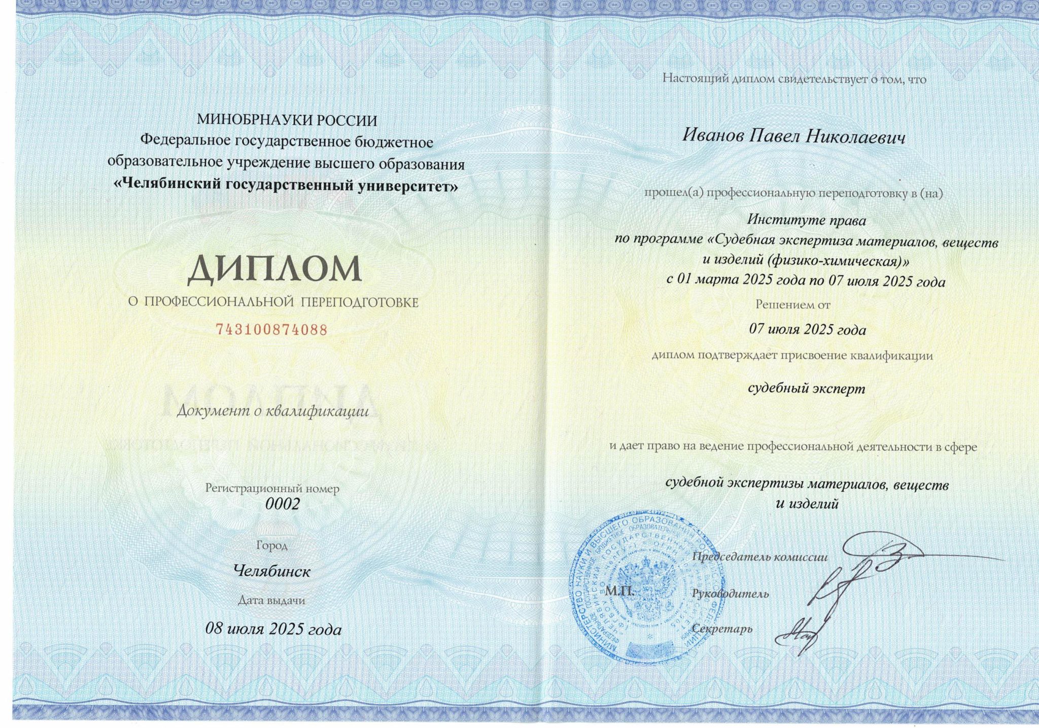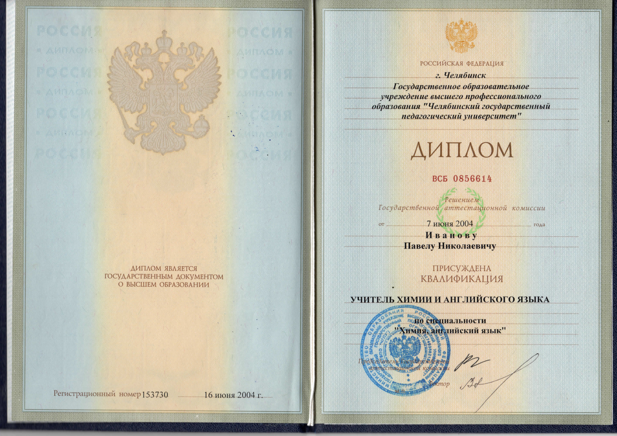 Высшее химическое, диплом об окончании ГОУВПО Челябинский государственный педагогический университет ВСБ 0856614 от 07.06.2004, квалификация «учитель химии и английского языка».